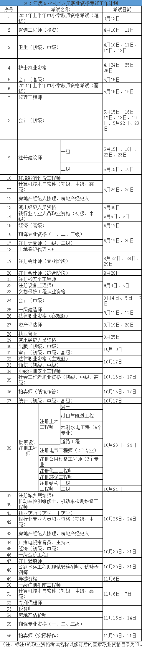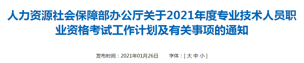 為做好專業(yè)技術(shù)人員職業(yè)資格考試規(guī)劃和管理工作,便于廣大專業(yè)技術(shù)人員參加職業(yè)資格考試,經(jīng)商有關(guān)部門同意,現(xiàn)就2021年度專業(yè)技術(shù)人員職業(yè)資格考試計劃及有關(guān)事項通知如下: