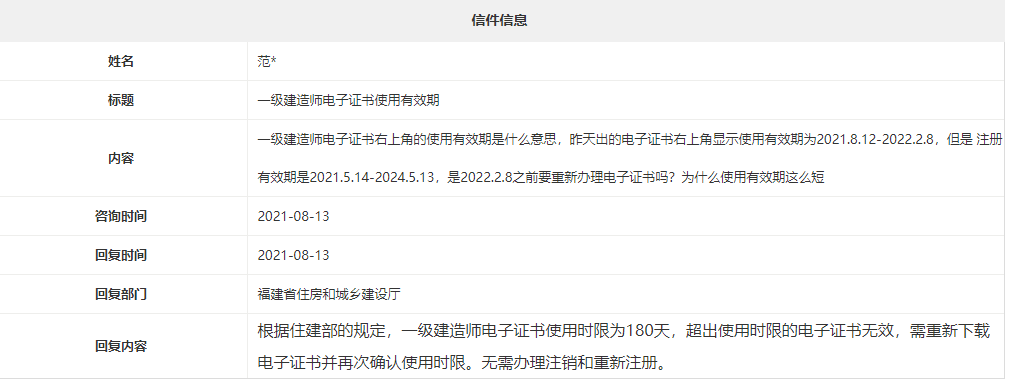 福建省住房和城鄉(xiāng)建設(shè)廳咨詢投訴信件中,有考生咨詢“一級建造師電子證書使用有效期”,具體內(nèi)容如下: