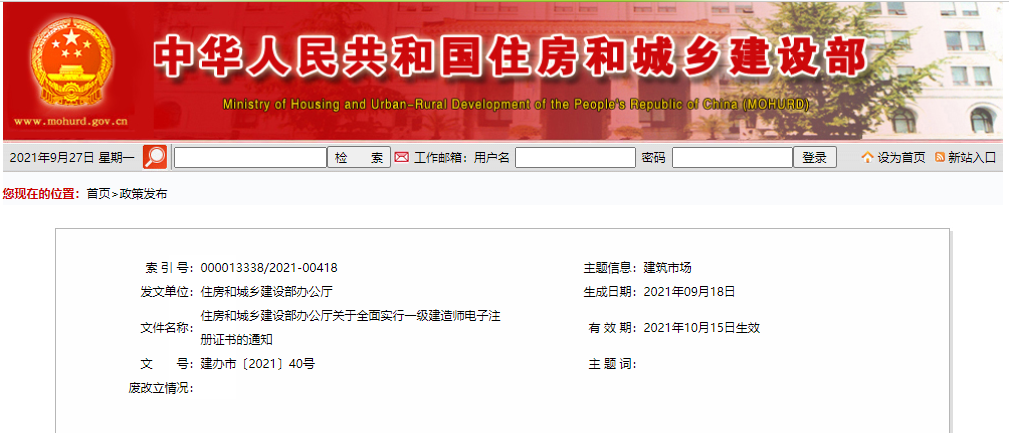 2.自 2021年10月15日起,全國范圍內準予一級建造 師初始注冊、增項注冊、重新注冊、延續注冊的,不再發放紙質注冊證書或加貼防偽貼;聘用單位基本信息修改的,不再加貼防偽貼;因紙質注冊證書遺失、污損或個人信息修改 等需重新發放注冊證書的,不再補發或更換紙質注冊證書。