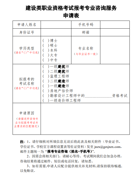 答復:專業是否符合報考條件,可填寫《建設類職業資格考試報考專業咨詢服務申請表》(詳見上表),發送至郵箱:jnzx@gzsjnzx.com進行咨詢。也可通過省住建廳官網-“職(從)業人員管理”欄目的“報考條件”子欄目中點擊“二級建造師考試報考條件(2019)”,打印填寫其中的最后一頁《建設類職業資格考試報考專業咨詢服務申請表》,發送至表中載明的郵箱進行咨詢。