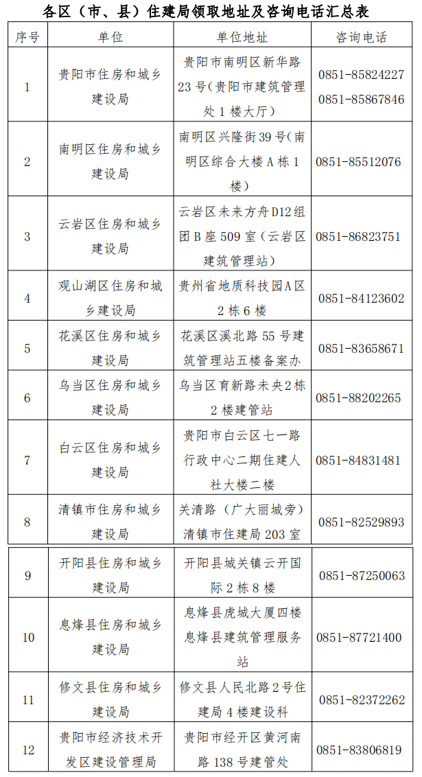 附件:各區(市、縣)住建局領取地址及咨詢電話匯總表: