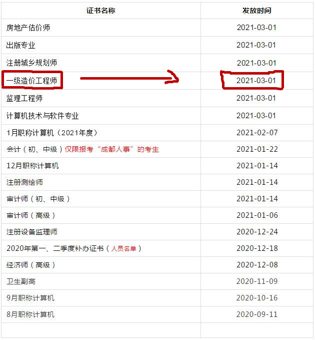 2020年四川成都一級造價工程師考試證書領(lǐng)取通知
