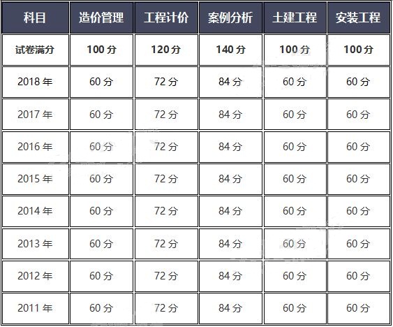 2011年-2018年造價工程師考試合格標準一直都是:"建設工程計價"科目為72分(試卷滿分120分),"工程造價案例分析"科目為84分(試卷滿分140分),"建設工程造價管理"科目和"建設工程技術與計量"科目的土建、安裝專業(yè)均為60分(試卷滿分卷均為100分)。如下表: