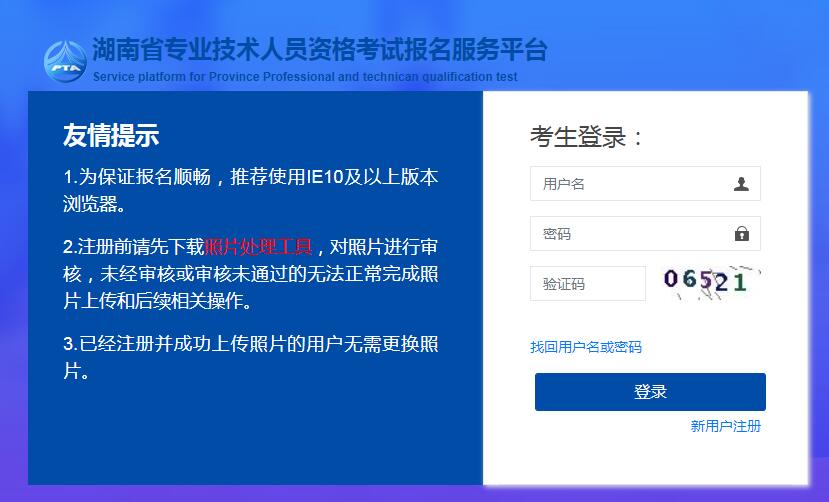 1.使用“湖南省專業技術人員資格考試報名服務平臺”必須先進行注冊,注冊后才能進行報名操作。