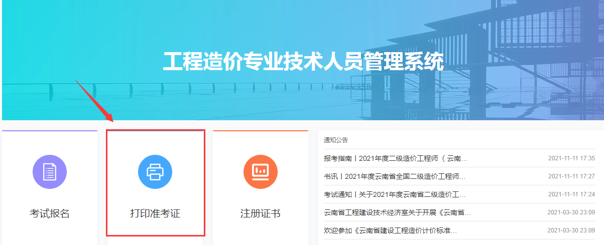 點擊進入>>云南2021年二級造價師考試準考證打印入口